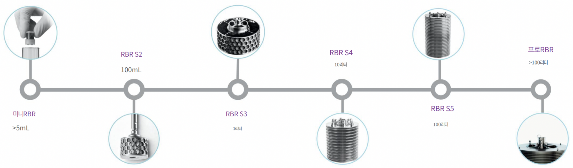 RBR 기술은 물질 전달 효율을 크게 향상시켜 반응 시간을 단축하고 수율을 높이며, 공정에 따라 시약 사용량과 운영 비용을 절감합니다. 또한 고체상 입자의 마모를 최소화해 촉매 수명을 연장하고 공정 안정성을 높입니다. 실험실 규모부터 생산 공정까지 우수한 확장성을 갖춰 5 mL부터 100,000 L, ProRBR 적용 시에는 수천 m³ 규모의 공정까지 대응 가능하며, 연구와 산업 현장을 모두 아우르는 효율적인 반응 솔루션을 제공합니다.