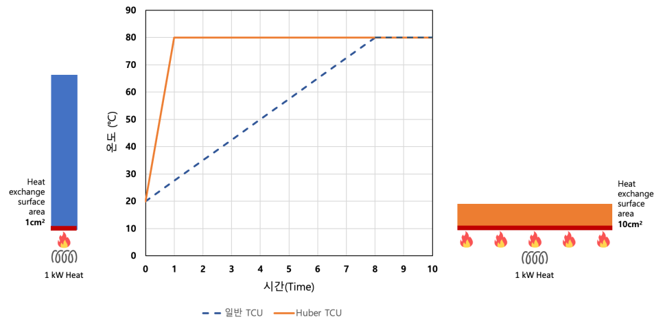TCU의 성능에서 중요한 요소 중 하나는 열 교환 면적입니다. 예를 들어 1kW의 가열 용량(heating power)이 1cm² 표면과 접촉하는 경우와 10cm² 표면과 접촉하는 경우를 비교하면 10cm²에서의 열전달 속도가 약 8배 빠릅니다. 이는 가열·냉각 시 맞닿는 면적이 넓을수록 목표 온도에 더 빨리 도달할 수 있다는 것을 의미합니다. Huber TCU는 이 면적 설계에서 높은 효율을 갖추고 있습니다.