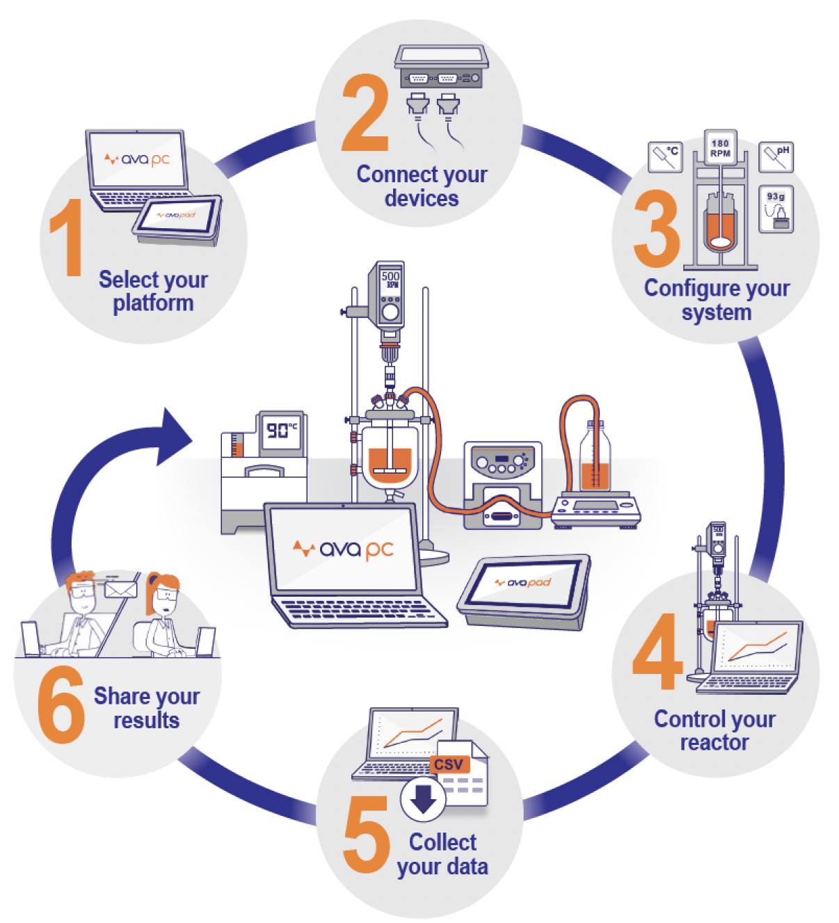AVA 소프트웨어는 모든 재킷형 실험실 반응기에 손쉬운 자동화를 제공하는 스마트 솔루션입니다. 간편한 설치와 직관적인 설계로 연구자의 실험 환경에 완벽하게 최적화되어 있으며, 순환기, 교반기, 펌프, 센서 등과 매끄럽게 연동되어 완전한 제어, 향상된 안전성, 그리고 정밀하고 일관된 실험 결과를 제공합니다. AVA Pad와 AVA PC 소프트웨어로 연구의 효율성과 정밀함을 한 단계 높이세요.